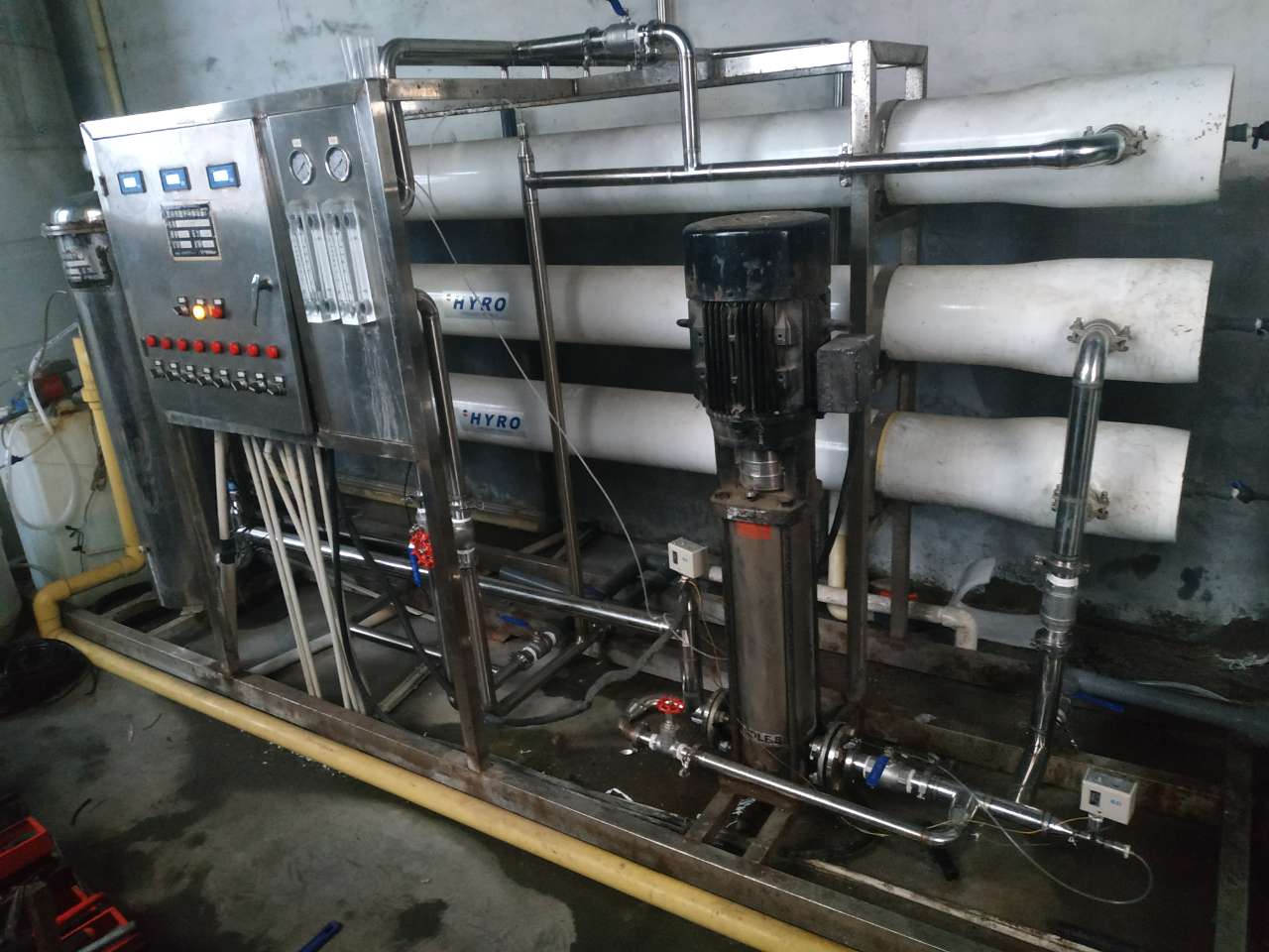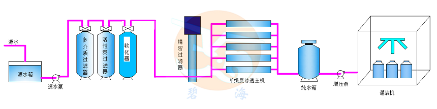 反渗透水质净化设备主机主要由保安过滤器、高压泵、反渗透膜及各种控制及显示仪表组成。