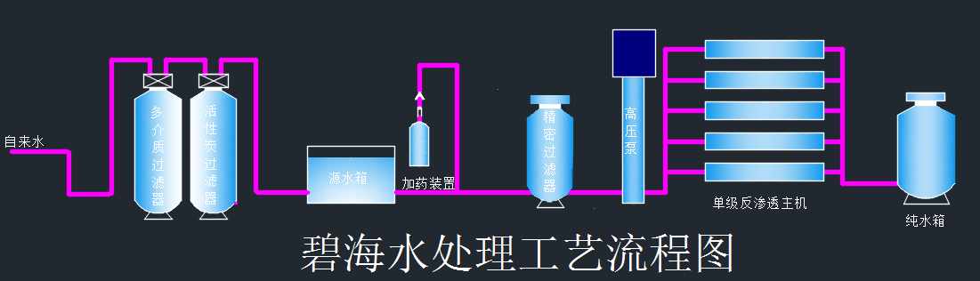 5、主要附件(控制系统、框架、水泵、反渗透膜和管道)均由国内外知名厂家提供,采用进口增压泵,高效率低噪音,系统运行可靠,维护简单,因此设备处理过程中没有相变,对材料的成分没有不利影响,不用大量的化学药剂和酸、碱再生处理,无化学废液排放,无环境污染。